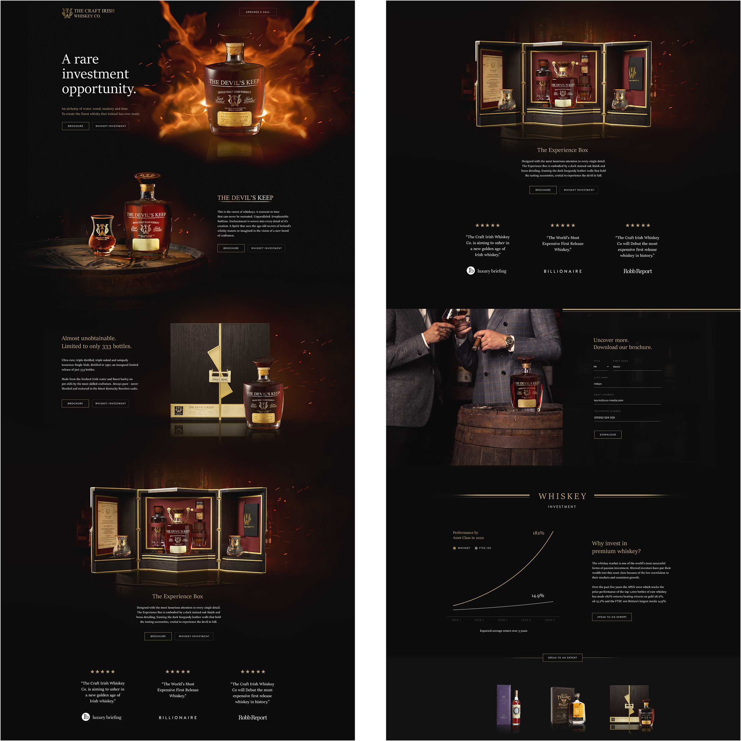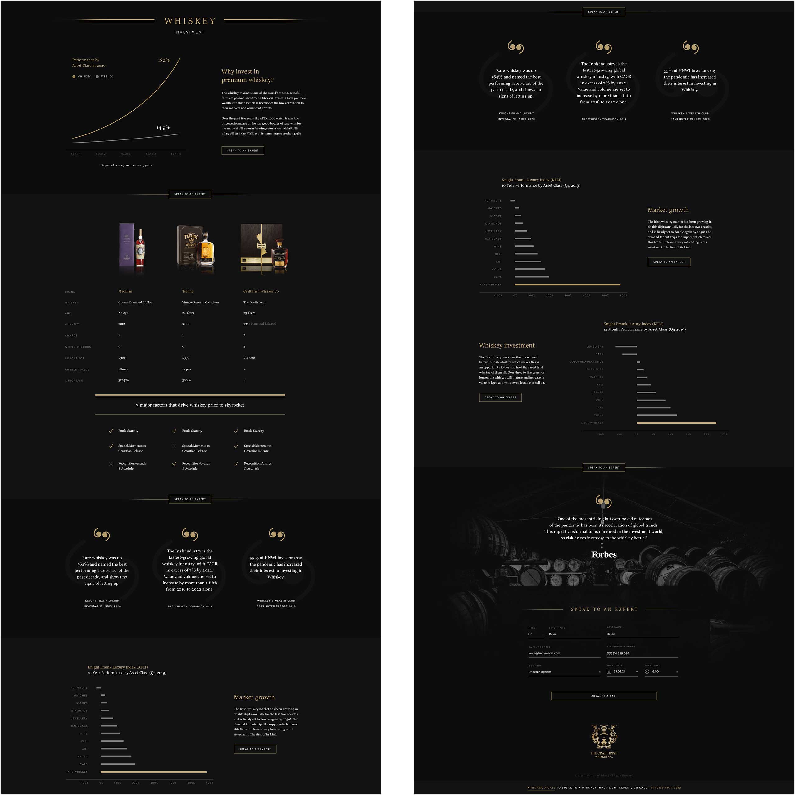 The whiskey market stands as one of the world's most successful forms of passion investment. Shrewd investors have entrusted their wealth to this asset class due to its consistent growth. We crafted a series of campaign landing pages, each a gateway into an immersive experience, adorned with captivating hero images that beckon like liquid gold. Employing predictive AI, we tested and optimized every landing page design, ensuring CTAs fell within hot zones, resulting in significant improvements to on-site conversions. This has elevated the Craft Irish Whisky Co to new heights of desirability.